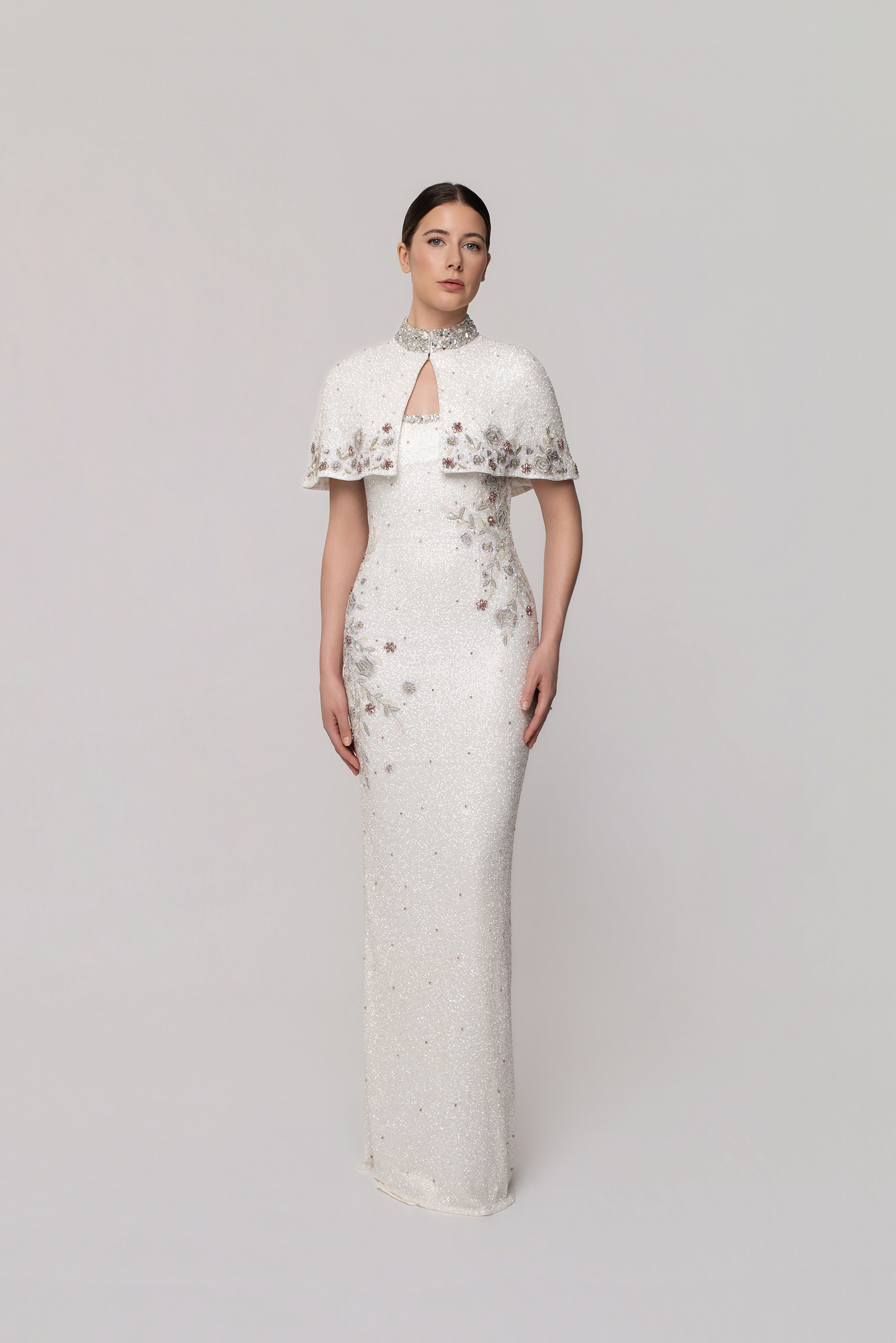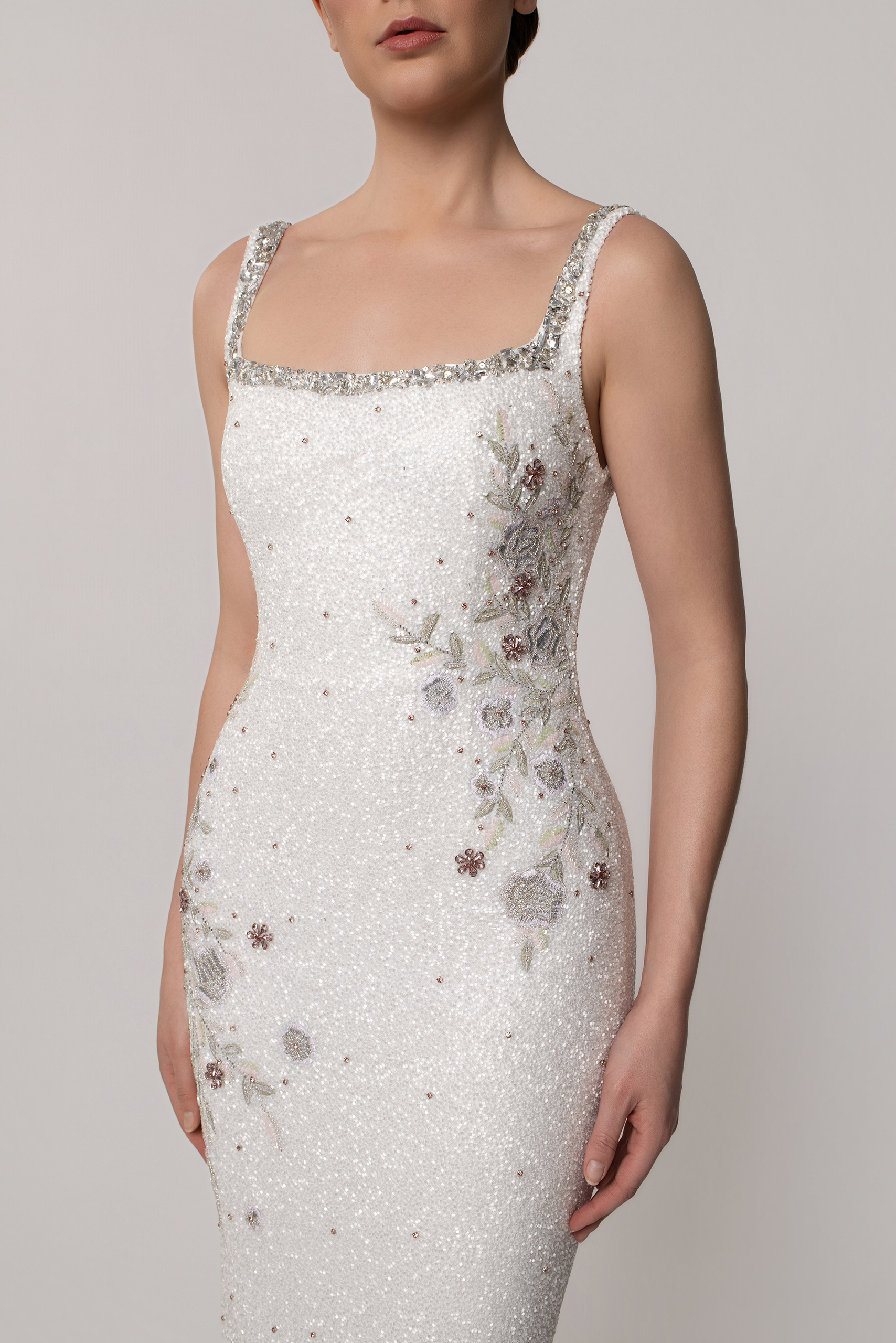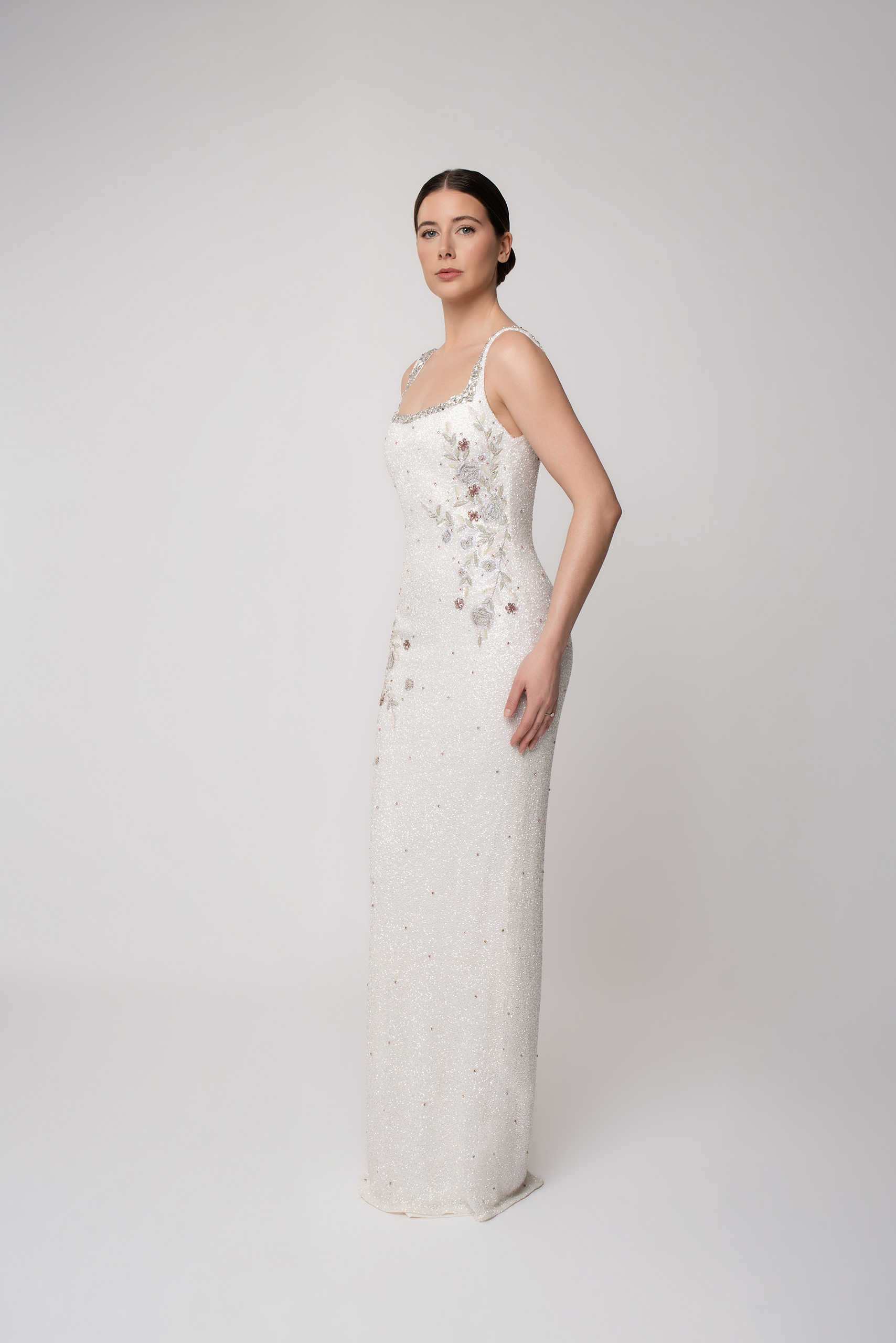 Clementine is a beautiful full length bridal dress with intricate hand beaded flowers that are subtle yet impactful for your wedding moments. With a modern square neckline and flattering silhouette, Clementine is the perfectly pretty choice for any of your wedding celebration needs. Perfectly paired with our marching Clementine cape for the complete bridal look.